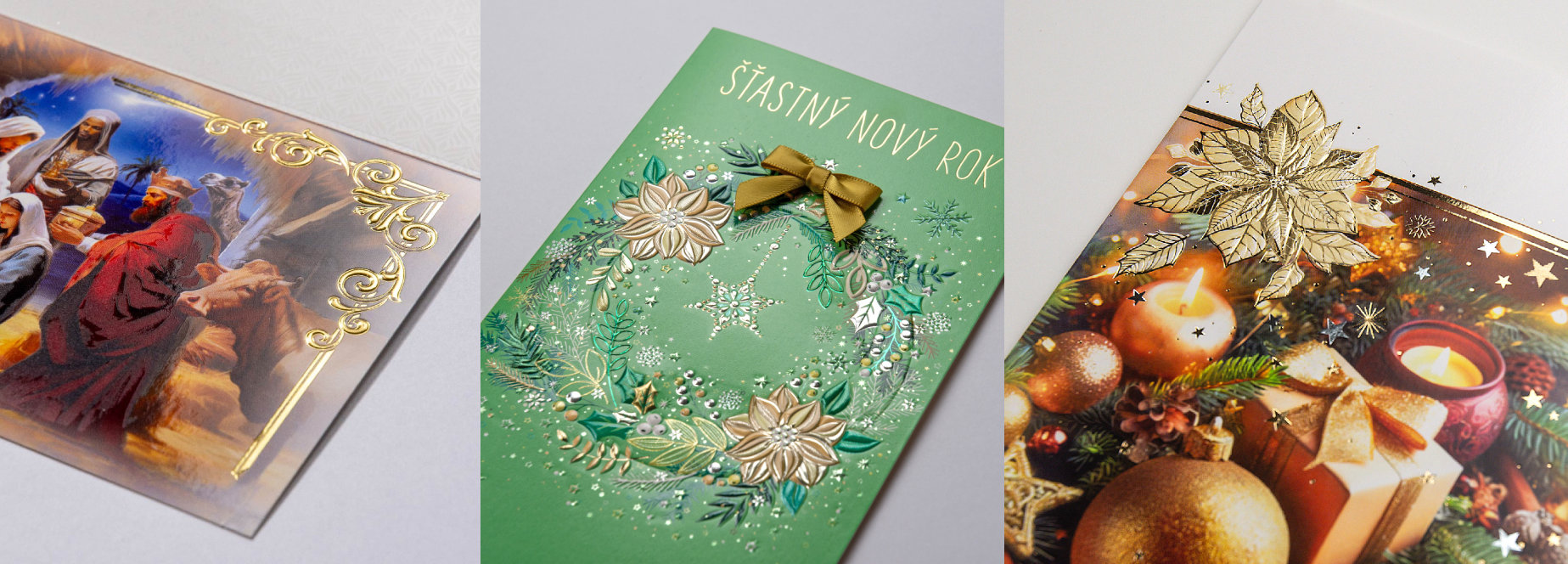 • Foil stamping – shiny gold or silver accents that give a festive touch.
